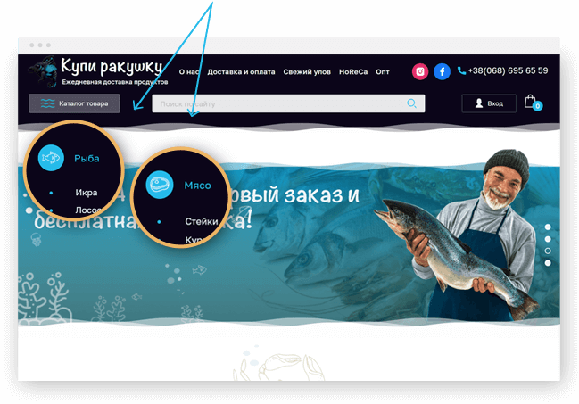 1. Воспользуйтесь меню, нажав на Каталог. Например, Рыба или Мясо