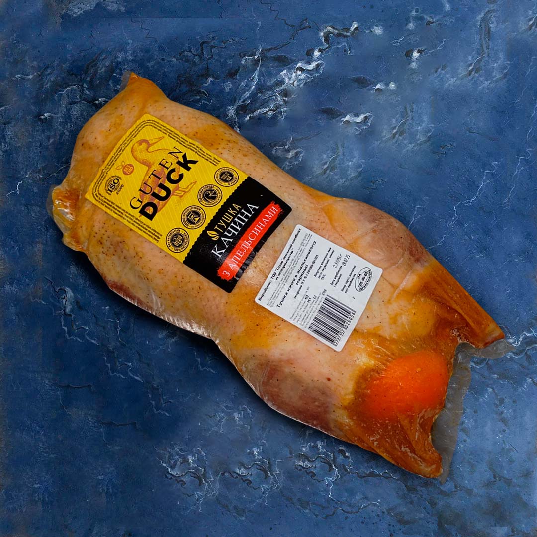 Тушка утки в маринаде (апельсин) готова к запеканию или тушению, что экономит время и сразу делает блюдо вкусным и ароматным.
